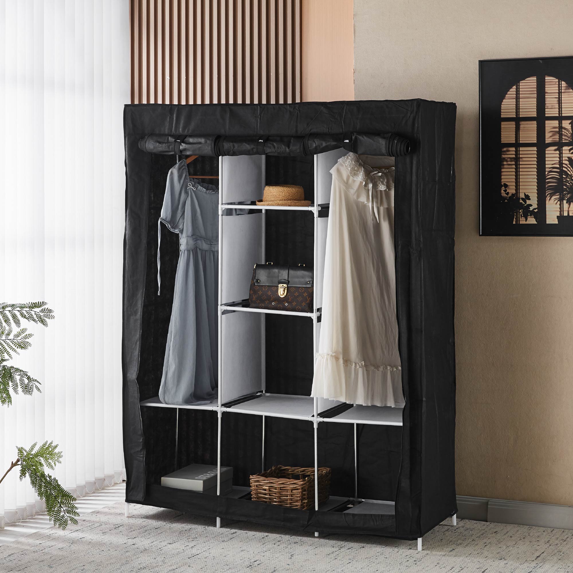 ✔️GRANDE CAPACITA' E ORGANIZZAZIONE INTELLIGENTE: Armadio portatile con ampio spazio interno, dotato di barra appendiabiti per vestiti lunghi e ripiani centrali per borse, scatole, biancheria e accessori. Ideale per mantenere tutto ordinato in poco spazio.