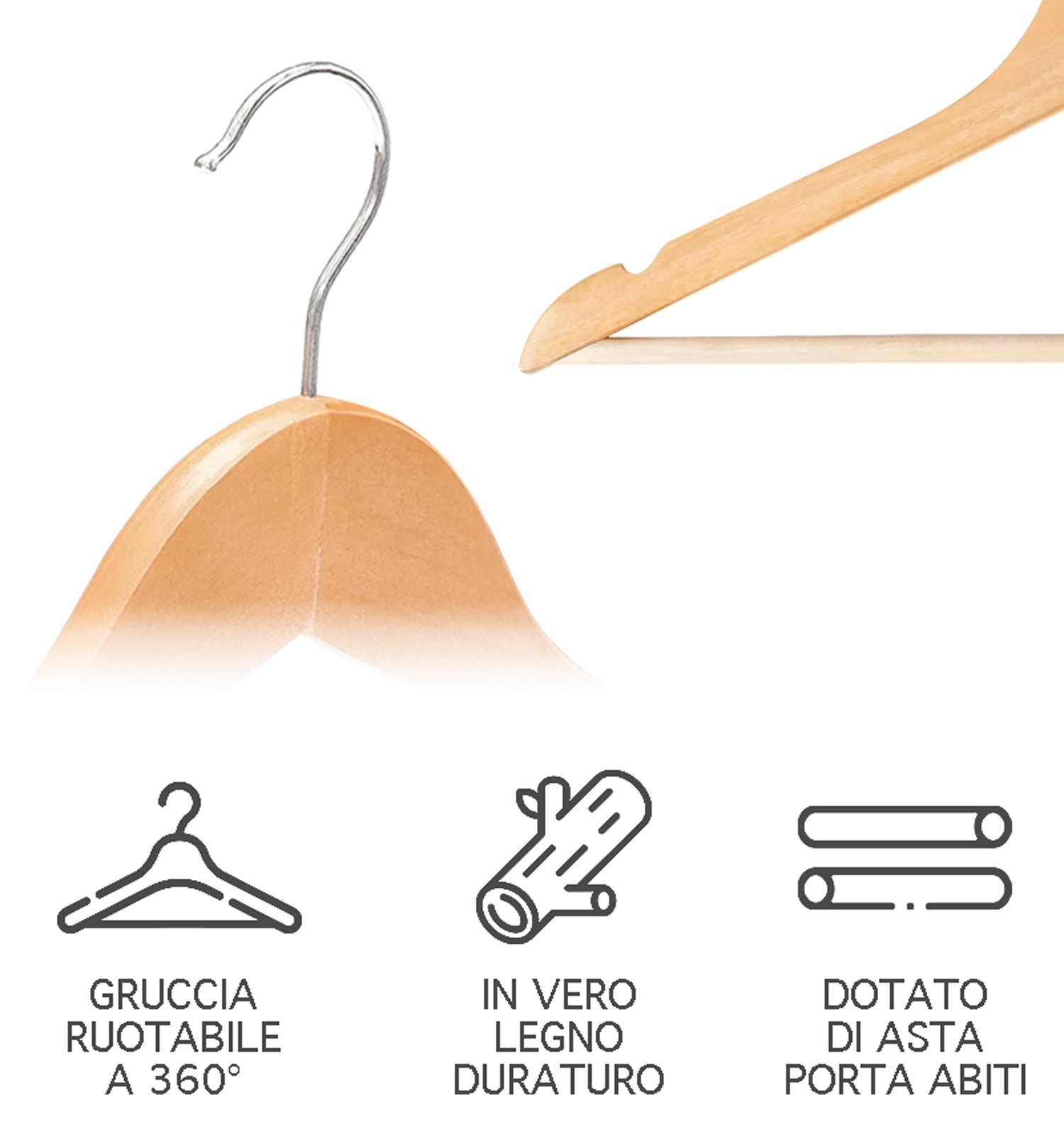 ✔️Resistenti: Realizzate in legno di qualità, queste grucce sono robuste con barra rinforzata e durevoli e possono supportare vestiti di tutte le stagioni, anche se appendi giacche o cappotti invernali pesanti