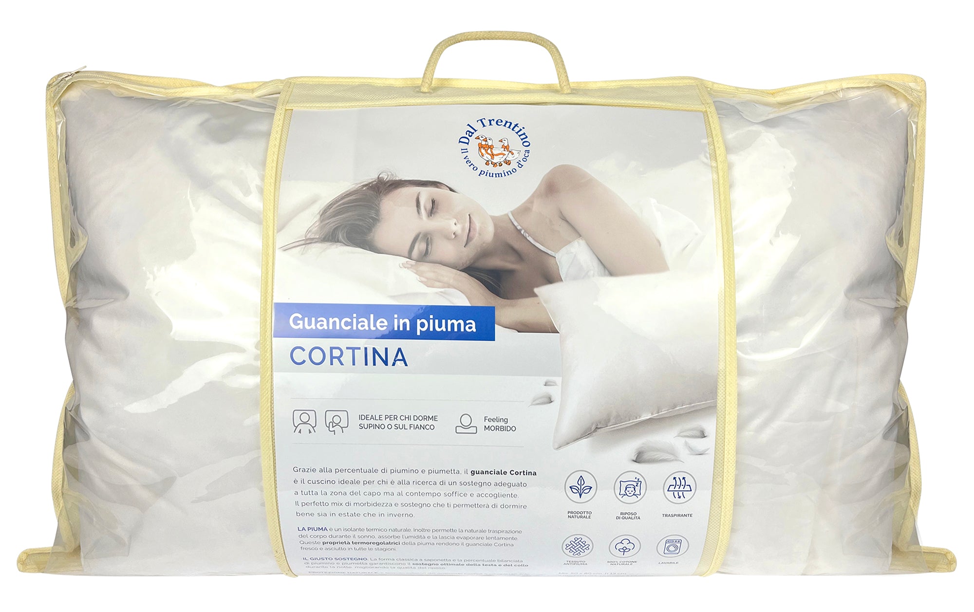Qualità: Il guanciale Cortina è la scelta perfetta per chi cerca un cuscino che unisca morbidezza e sostegno. Realizzato con una percentuale bilanciata di piumino e piumetta, offre un supporto adeguato per la testa e il collo, garantendo un sonno confortevole in ogni stagione. La sua forma classica a saponetta contribuisce a migliorare la qualità del riposo, rendendolo ideale sia per l'estate che per l'inverno.