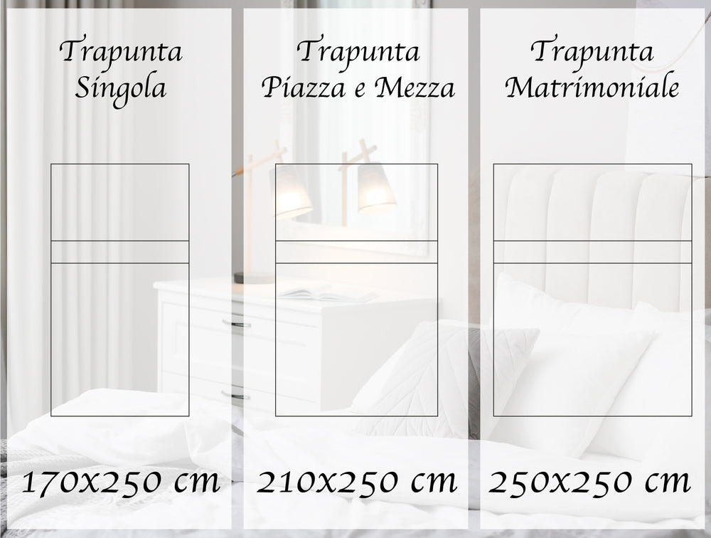 Dimensioni e Manutenzione: Misura Singola 170 x 250 Cm - Misura Piazza Mezza 210 x 250 Cm - Misura Matrimoniale 250 x 250 Cm, Lavabile in Lavatrice a 30°, Non necessita di Stiro.