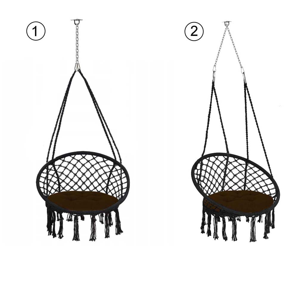 Montaggio La poltrona è dotata di due anelli di metallo anticorrosione fissati saldamente a quattro corde, in modo da farvi appendere la sedia in modo semplice, sicuro e veloce.