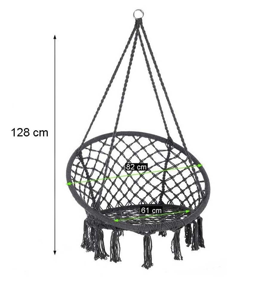 Dimensioni: Diametro della seduta 61 cm, diametro dell'anello esterno 82 cm, altezza totale: 128 cm. Cuscino rotondo super soffice dal diametro 55 cm sfoderabile per consentirne il lavaggio ogni volta che lo vorrete