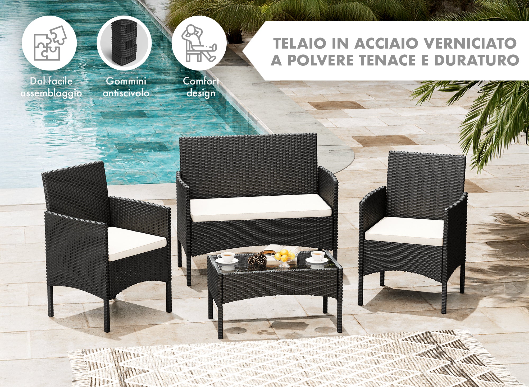 RESISTENZA ALLE INTEMPERIE E SICUREZZA:Questo salottino è completamente waterproof, il che significa che può essere lasciato all'aperto senza preoccupazioni, anche in caso di pioggia o umidità. Il tavolino è dotato di un ripiano in vetro temperato, facile da pulire e resistente, con gommini antiscivolo e anticaduta per garantire stabilità e sicurezza. La struttura in acciaio verniciato a polvere è solida e resistente nel tempo, assicurando una lunga durata del prodotto.