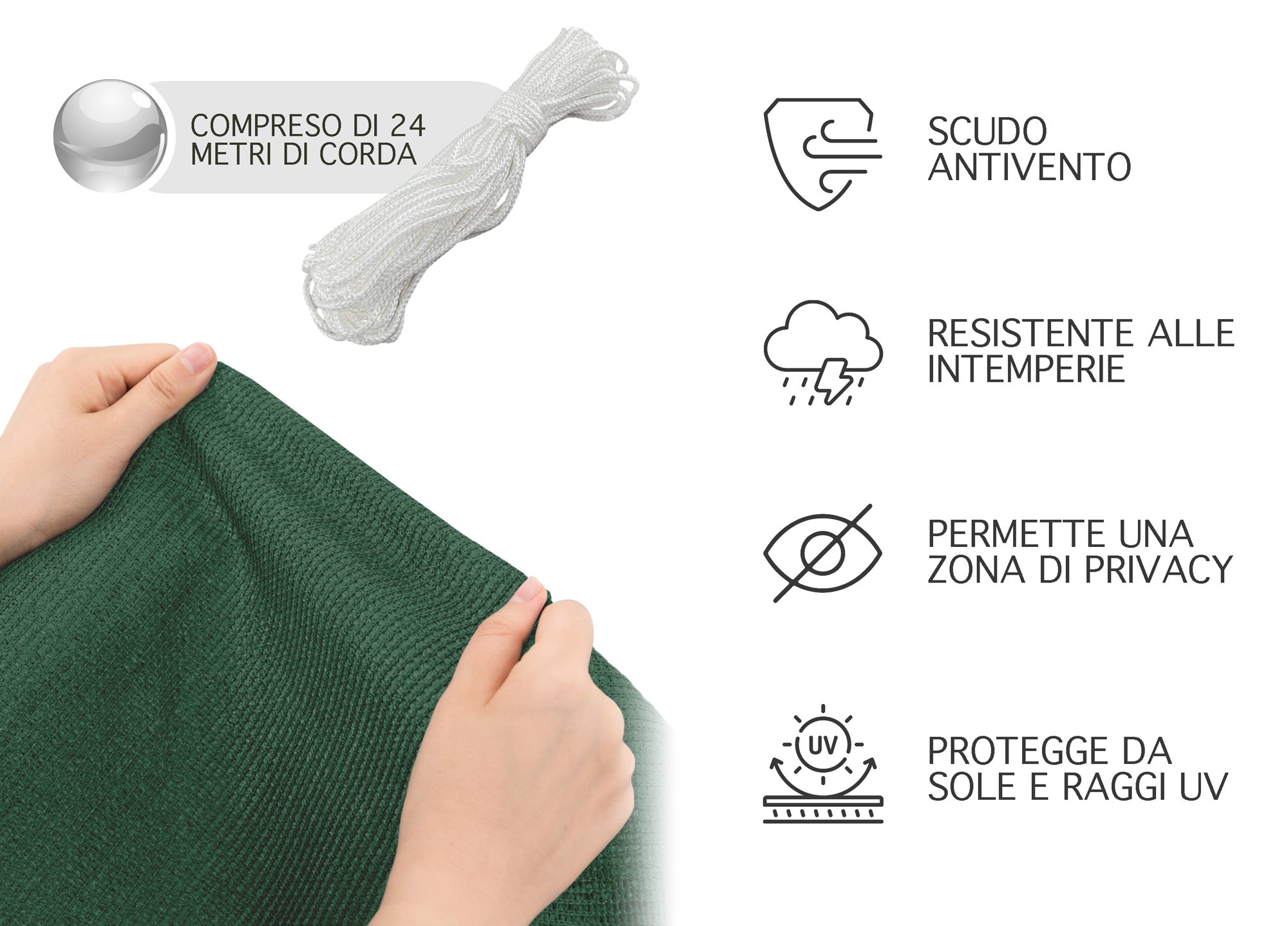Facile Installazione: Si monta in pochi minuti utilizzando la corda in dotazione di 24 metri, facile da applicare alle ringhiere di balconi o giardini il telo dispone di pratici occhielli di alluminio