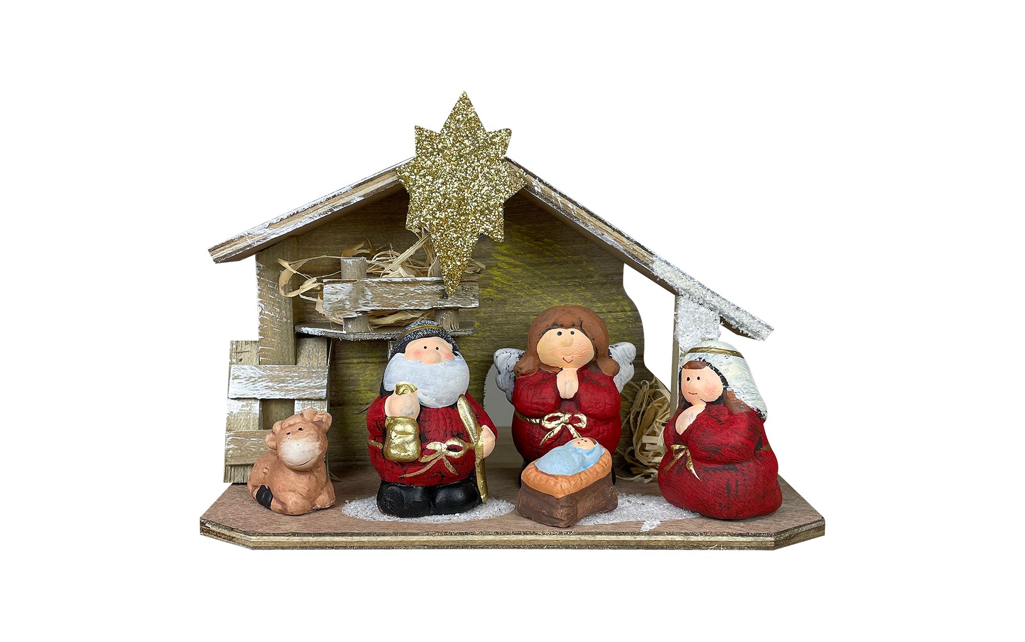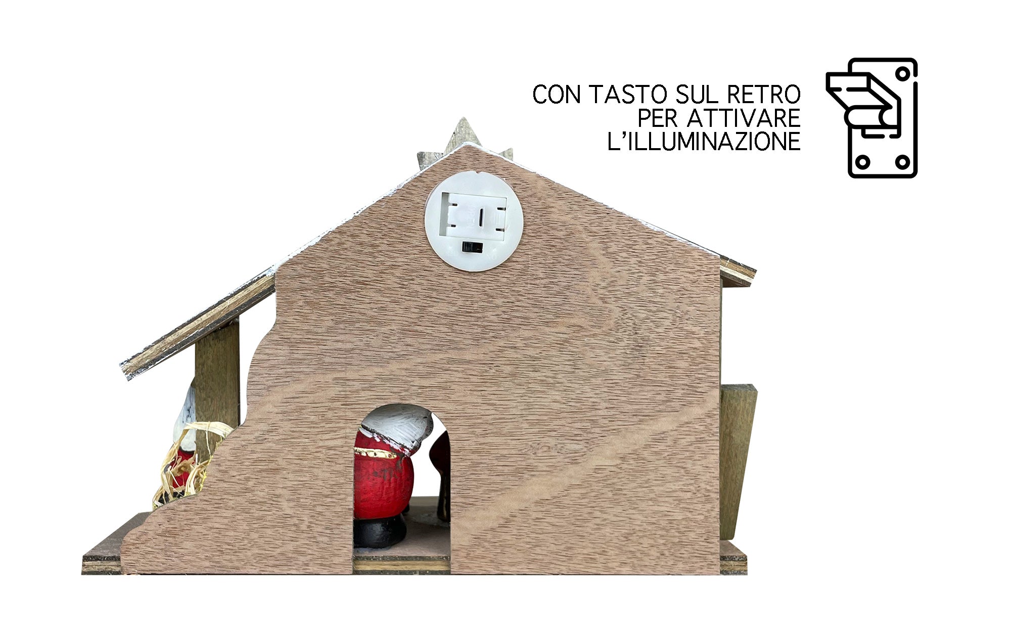 Questo presepio, interamente realizzato in terracotta con una struttura in legno, è decorato a mano con 4 personaggi: Gesù, Giuseppe, Maria e Babbo Natale. Le sue dimensioni sono di 16 cm di altezza, 8,2 cm di larghezza e 22,50 cm di lunghezza. Può essere alimentato grazie alla luce sfavillante che illumina il presepio attraverso una lampadina interna collocata sul retro e accesa tramite un bottone. Ideale per chi ama l'atmosfera del Natale, questo prodotto unico e moderno aggiunge innovazione alla tradizione.