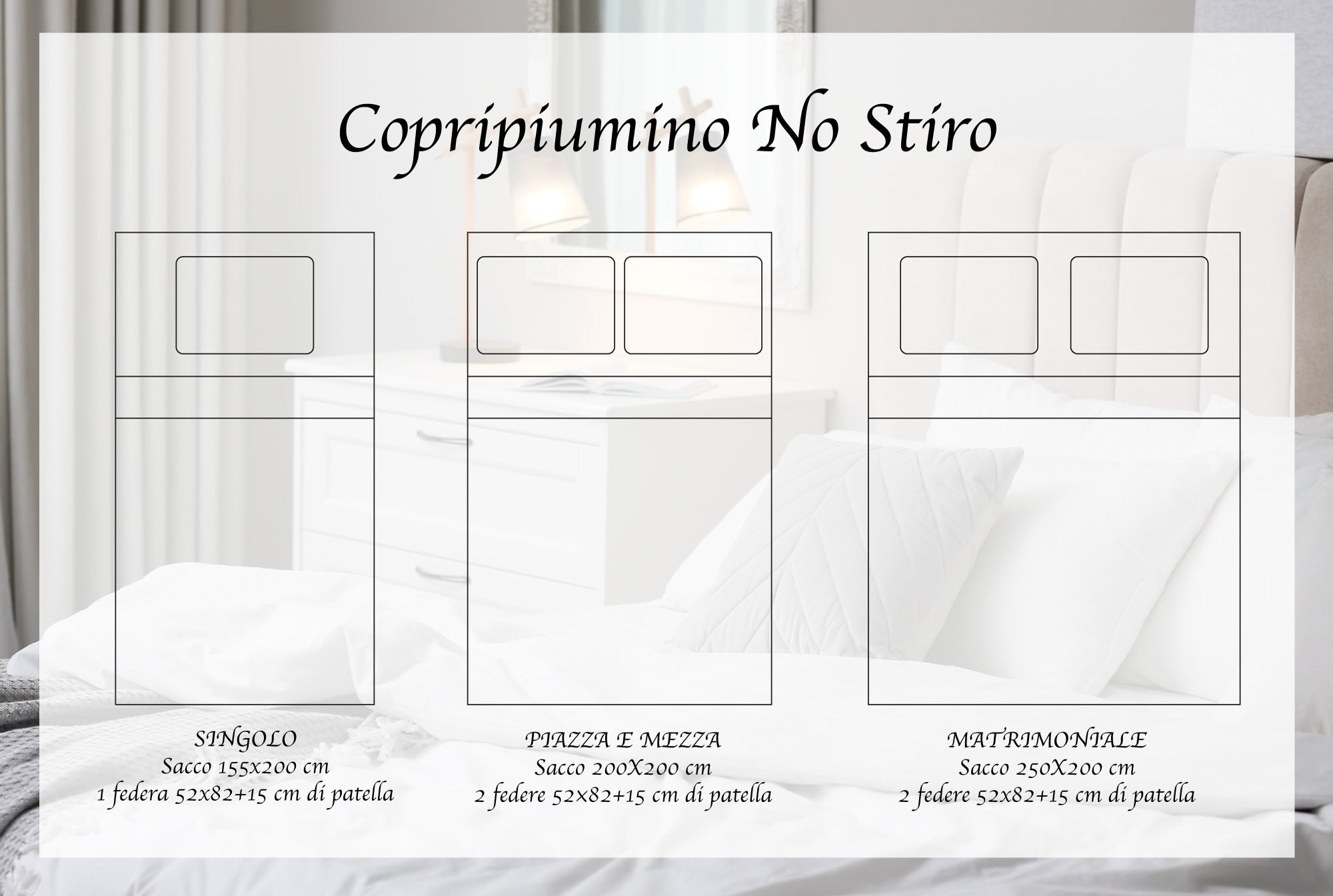 MATERIALE 100 % Microfibra morbidissima, anallergica, liscia e confortevole dall'effetto raso, autoregolante fresca in estate e calda in inverno Studiato per una praticità e una velocità di vestizione con patella interna al sacco di 50 cm per stabilizzare il piumino cosi che resti fisso e stabile per tutta la notte, e di 15 cm interna alle federe per fermare il guanciale i pratici tagli consentono l'inserimento del piumino e dei guanciali in pochi secondi.
