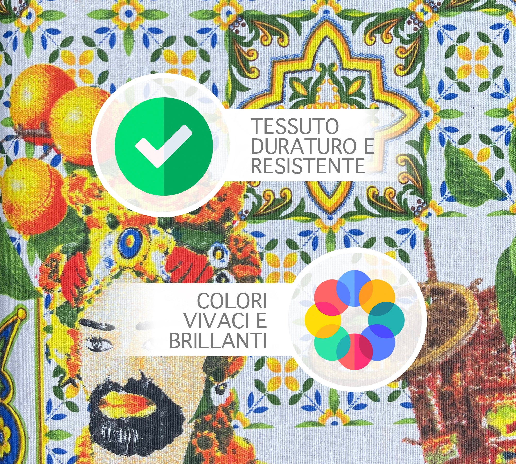 Composizione e Manutenzione: Composizione 60% tessuto in cotone Panama grosso robusto 40% Poliestere composizione studiata per dare morbidezza e lunga durata al prodotto colori resistenti nel tempo al continuo utilizzo e ai frequenti lavaggi in lavatrice a 30°, per tutte le istruzioni si consiglia di guardare l'etichetta interna del prodotto.