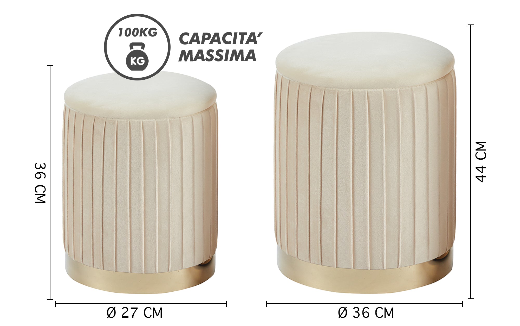✔️Dimensioni: Pouf Grande Diametro 36 Altezza 44 Cm Pouf Medio Diametro 27 Cm Altezza 36 Cm Portata Massima 100 Kg Oltre che essere belli esteticamente i pouf sono perfetti per ogni stanza grazie alle misure che li rendono adatti ad ogni tipo di soggiorno, camera, ingresso