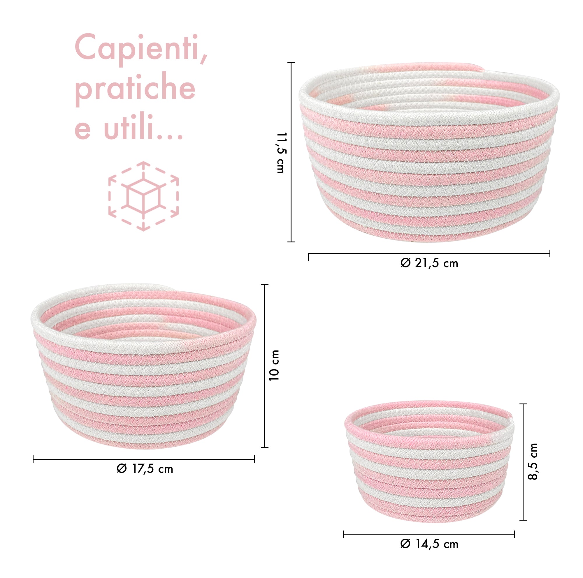 Utilizzo Multifunzionale: Questi cestini sono perfetti per una vasta gamma di utilizzi, dalla cameretta dei bambini al soggiorno, dal bagno all'ufficio. Sono ideali per riporre giocattoli, biancheria, accessori, cosmetici e molto altro. Grazie alla loro versatilità, possono essere utilizzati ovunque, aiutandoti a mantenere l'ordine e a ottimizzare gli spazi.