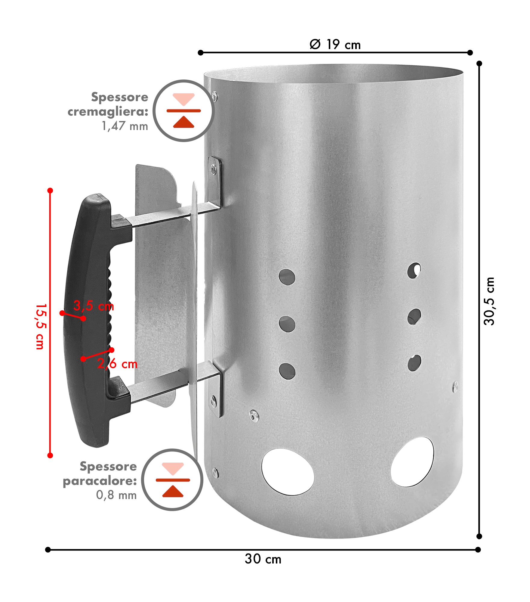 ✔️SPECIFICHE TECNICHE: Con dimensioni di 30 cm di altezza e 19 cm di diametro, questa ciminiera ha una capienza di circa 2 KG di carbone. È progettata per resistere a temperature elevate fino a 800 gradi ed è antiruggine, oltre ad essere certificata secondo la norma EN 1860, garantendo così qualità e sicurezza nel suo utilizzo.