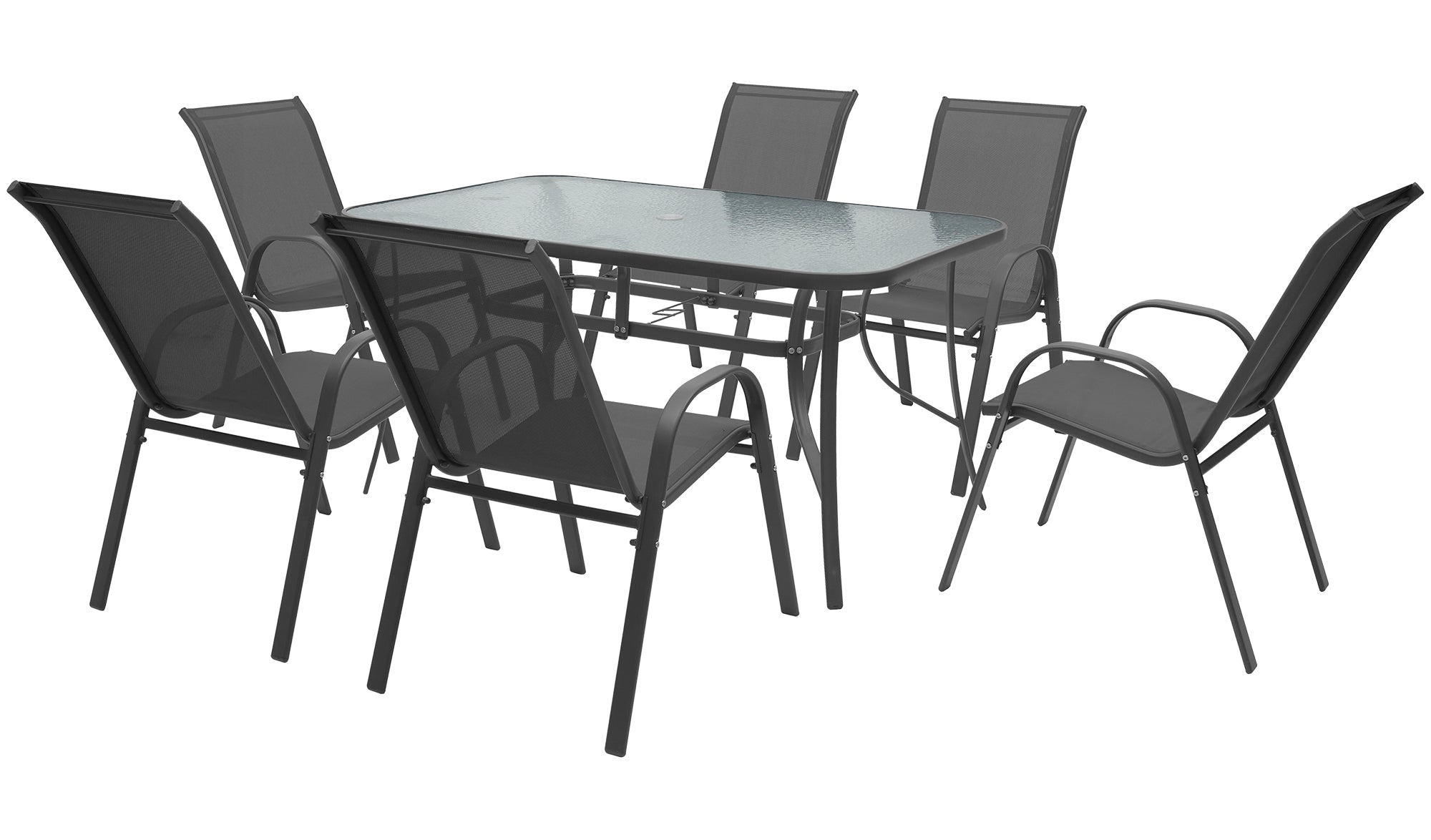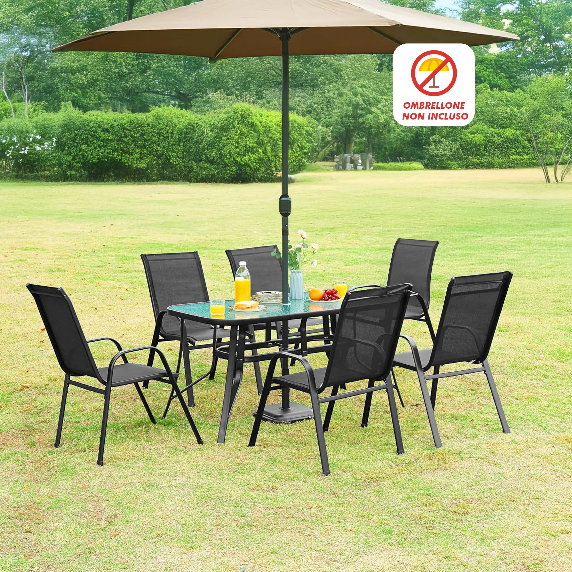Set Tavolo e Sedie da Giardino 7 Pezzi in Metallo con Piano in Vetro e Foro Ombrellone Il Gruppone