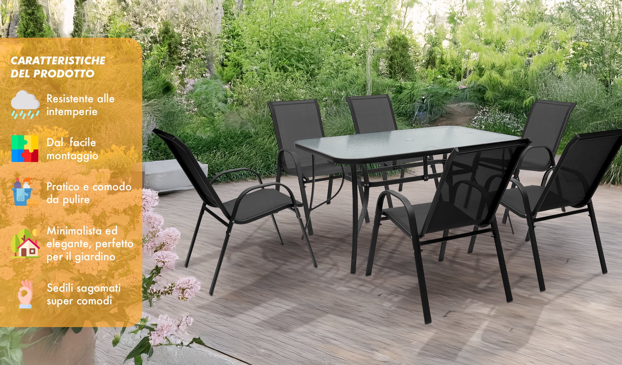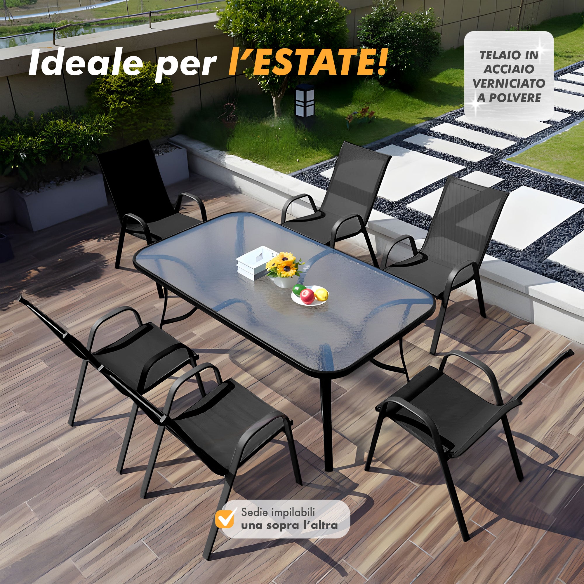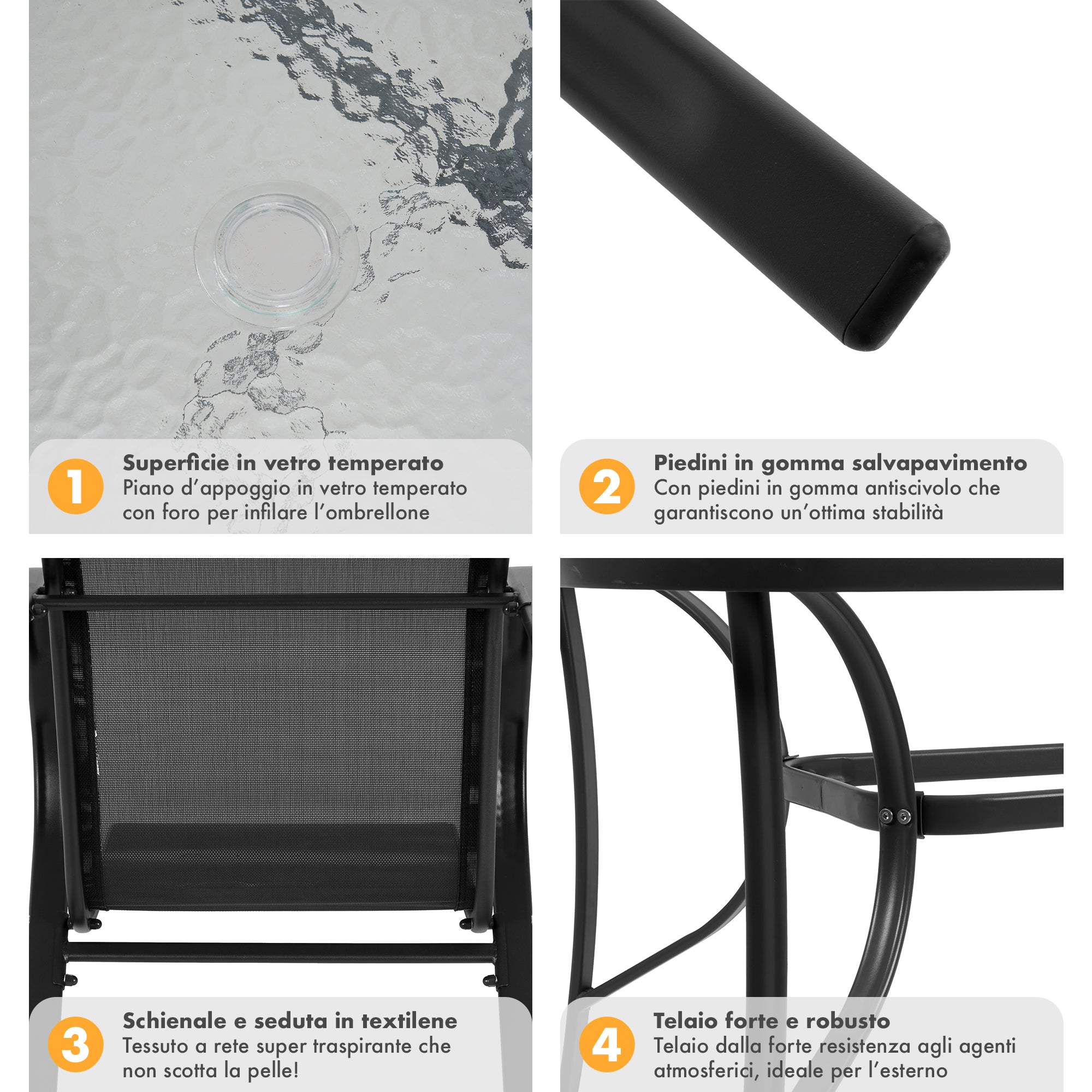 SET TAVOLO E SEDIE: Questo elegante set è composto da un tavolo in acciaio con un raffinato pianale in vetro temperato, resistente agli urti e dotato di un pratico foro per ombrellone. Con un peso di 48 kg, il tavolo offre una stabilità eccezionale, perfetta per ospitare pranzi e cene all'aperto, mentre il design moderno si integra armoniosamente in qualsiasi ambiente esterno.