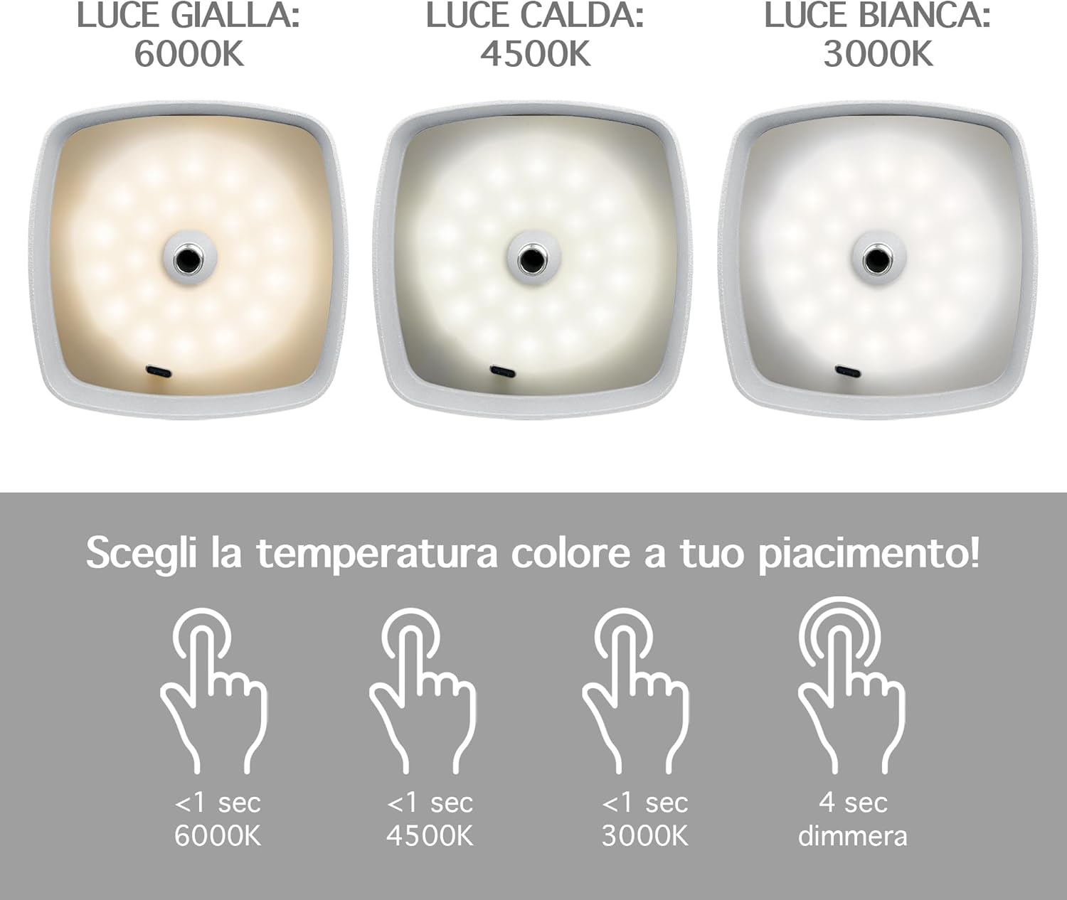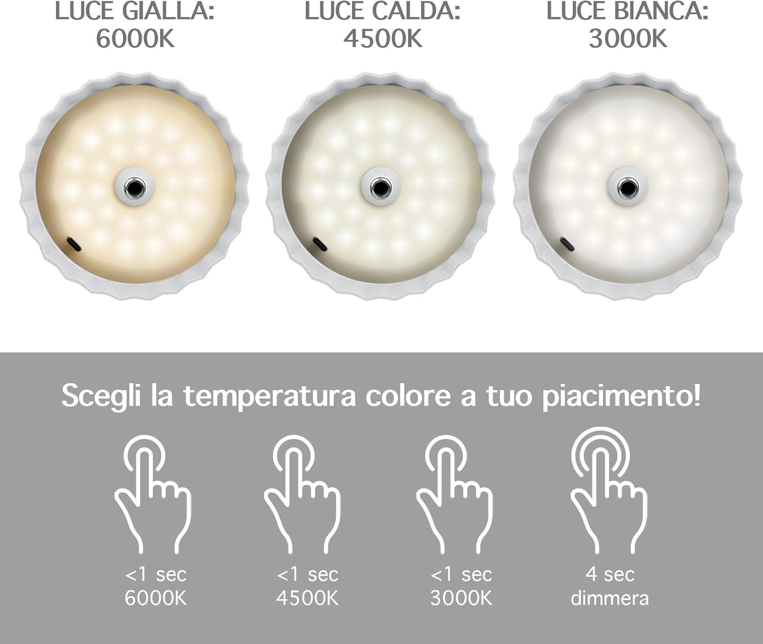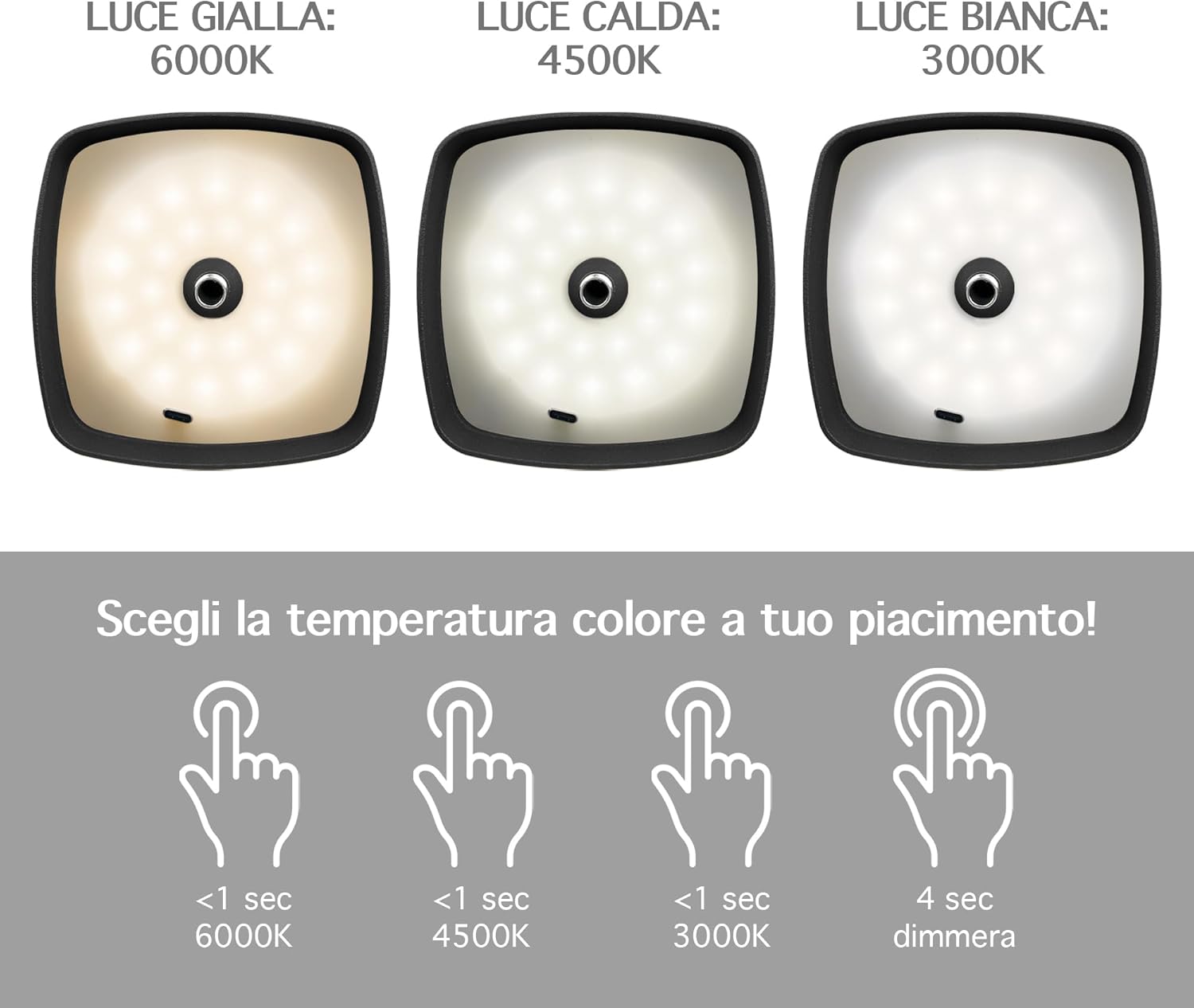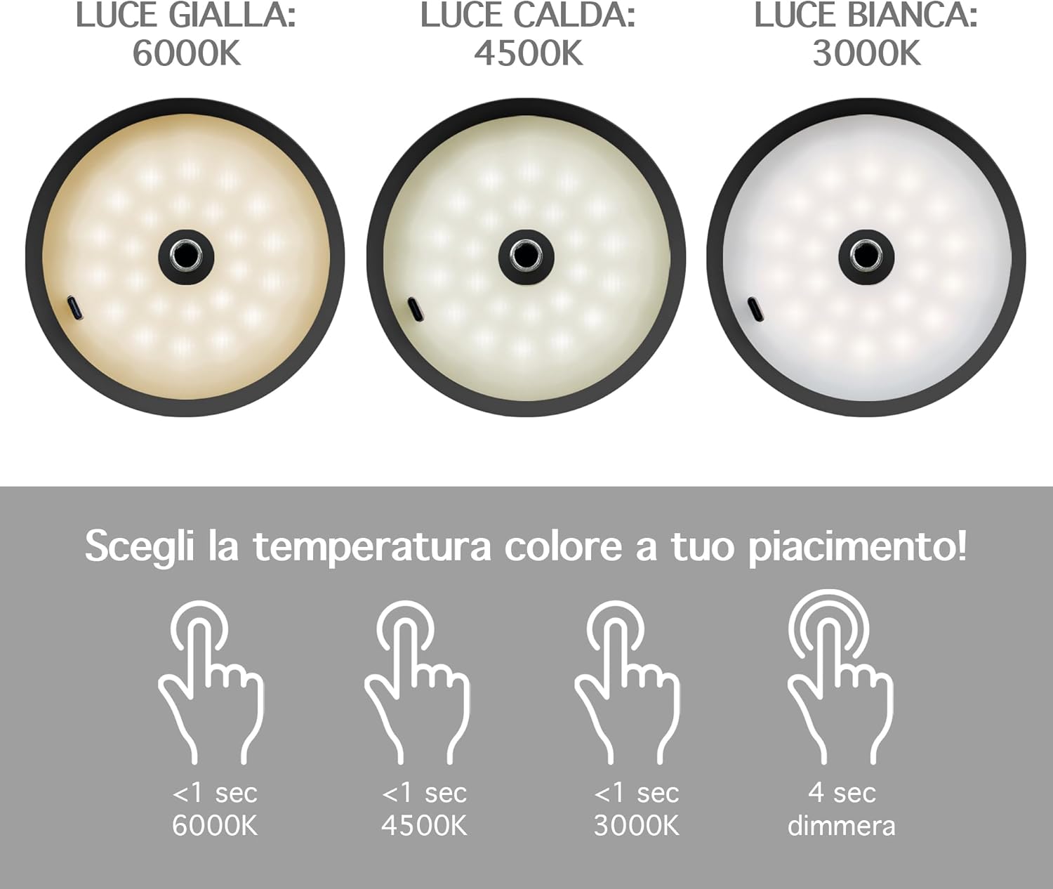 ✔️TOCCO TOUCH E DIMMERABILE: Tramite il pulsante Touch Presente sulla parte superiore della lampada con tocchi alternati è possibile cambiare il colore della luce Calda/Fredda/Naturale mentre con un tocco prolungato è possibile regolarne l'intensità ( Funzione Dimmerabile ) Con 3 Diverse temperatura di calore 3000/4500/6000 k