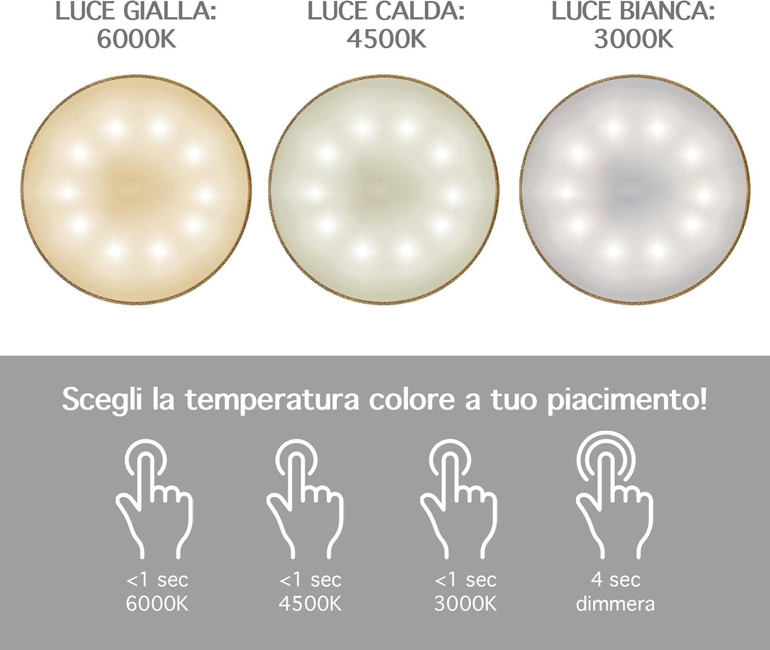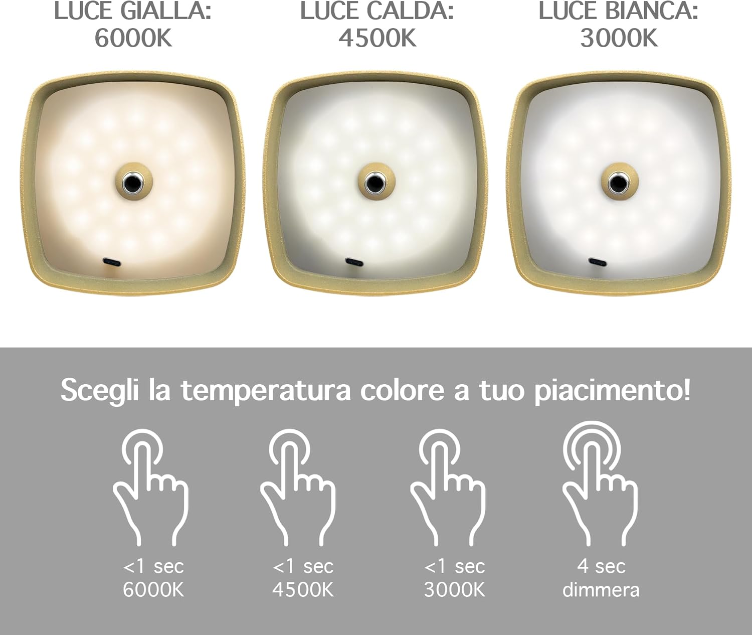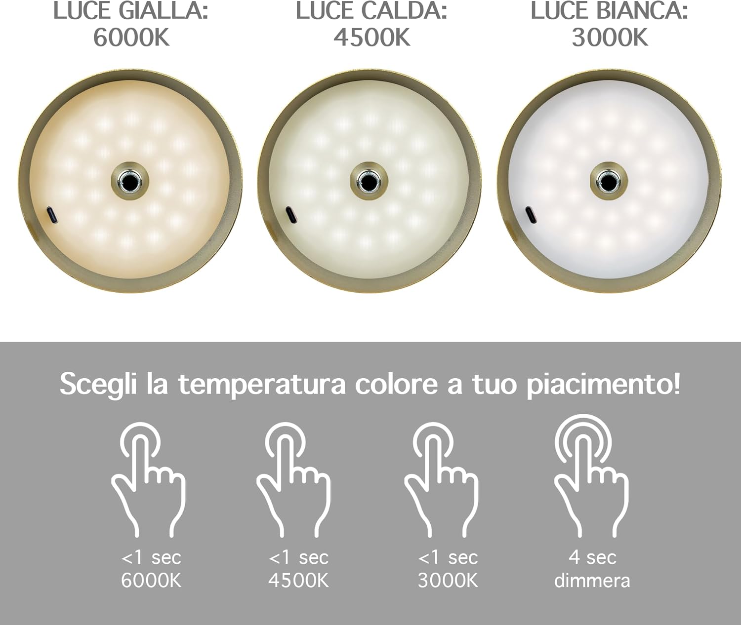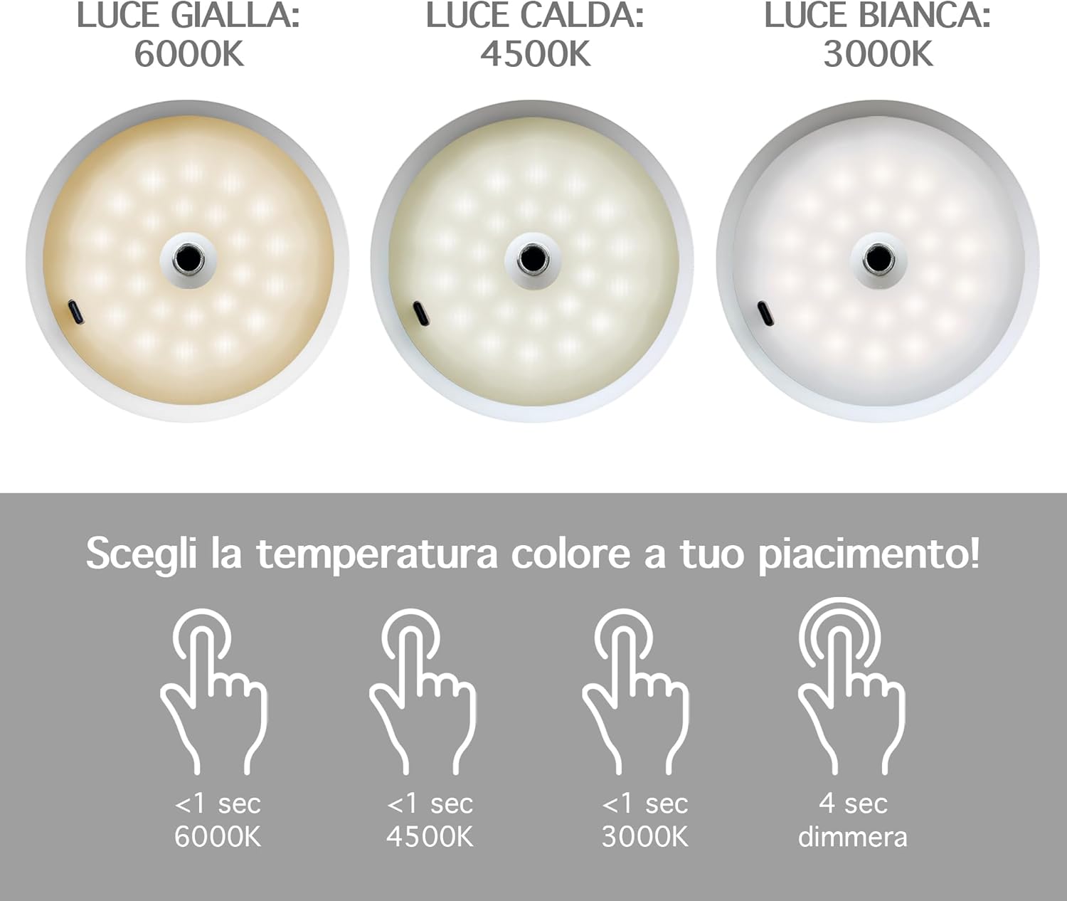 ✔️TOCCO TOUCH E DIMMERABILE: Tramite il pulsante Touch Presente sulla parte superiore della lampada con tocchi alternati è possibile cambiare il colore della luce Calda/Fredda/Naturale mentre con un tocco prolungato è possibile regolarne l'intensità ( Funzione Dimmerabile ) Con 3 Diverse temperatura di calore 3000/4500/6000 k