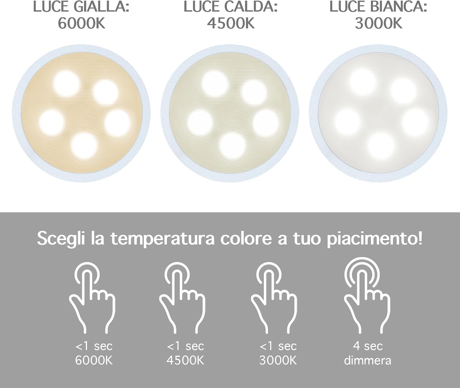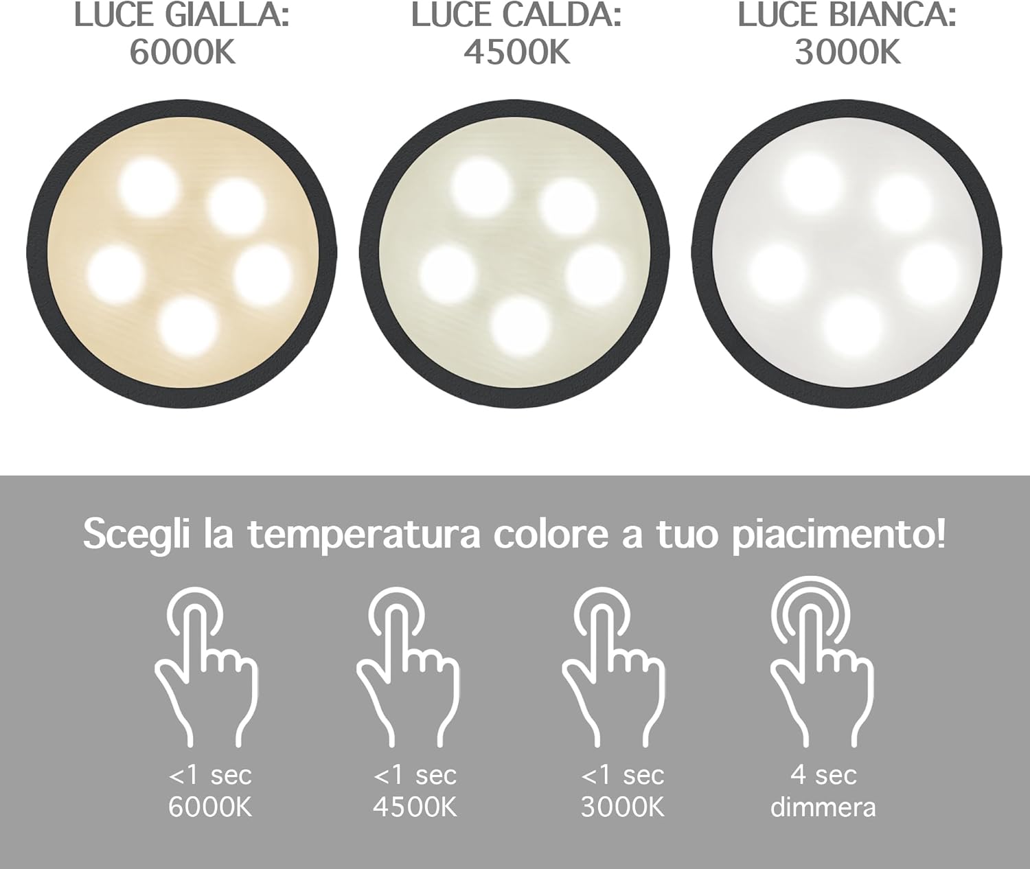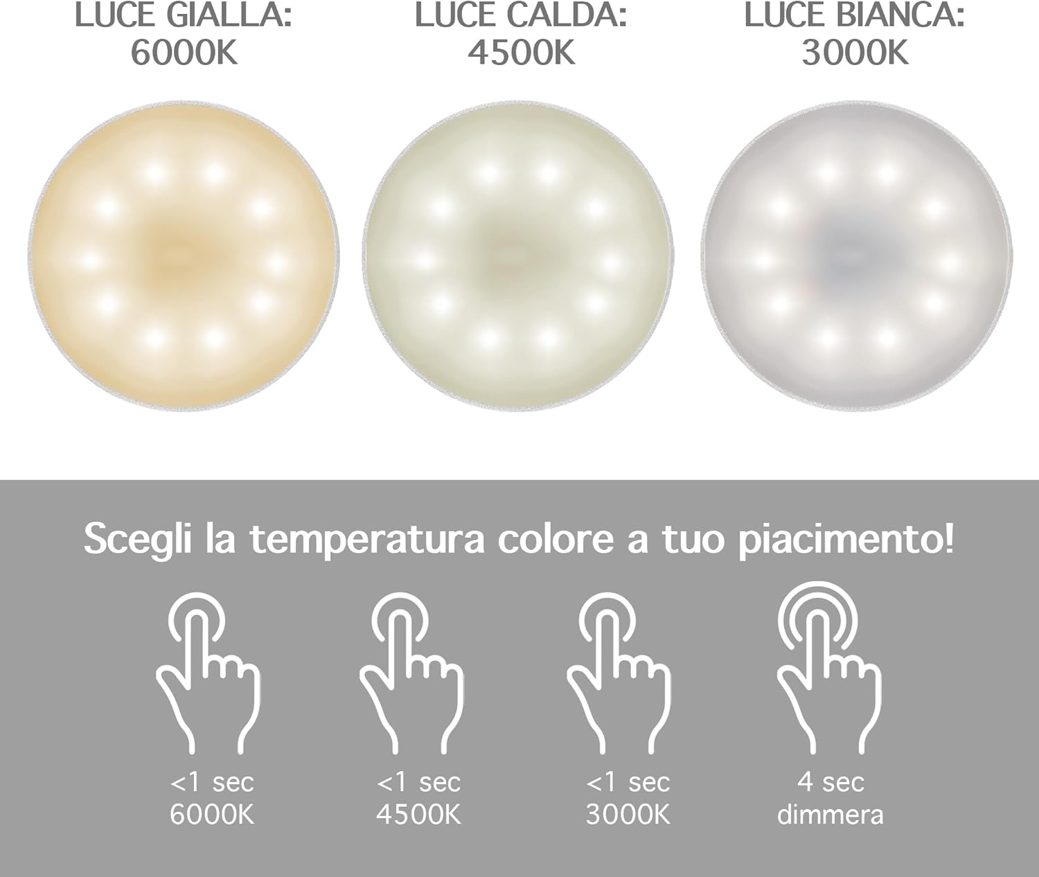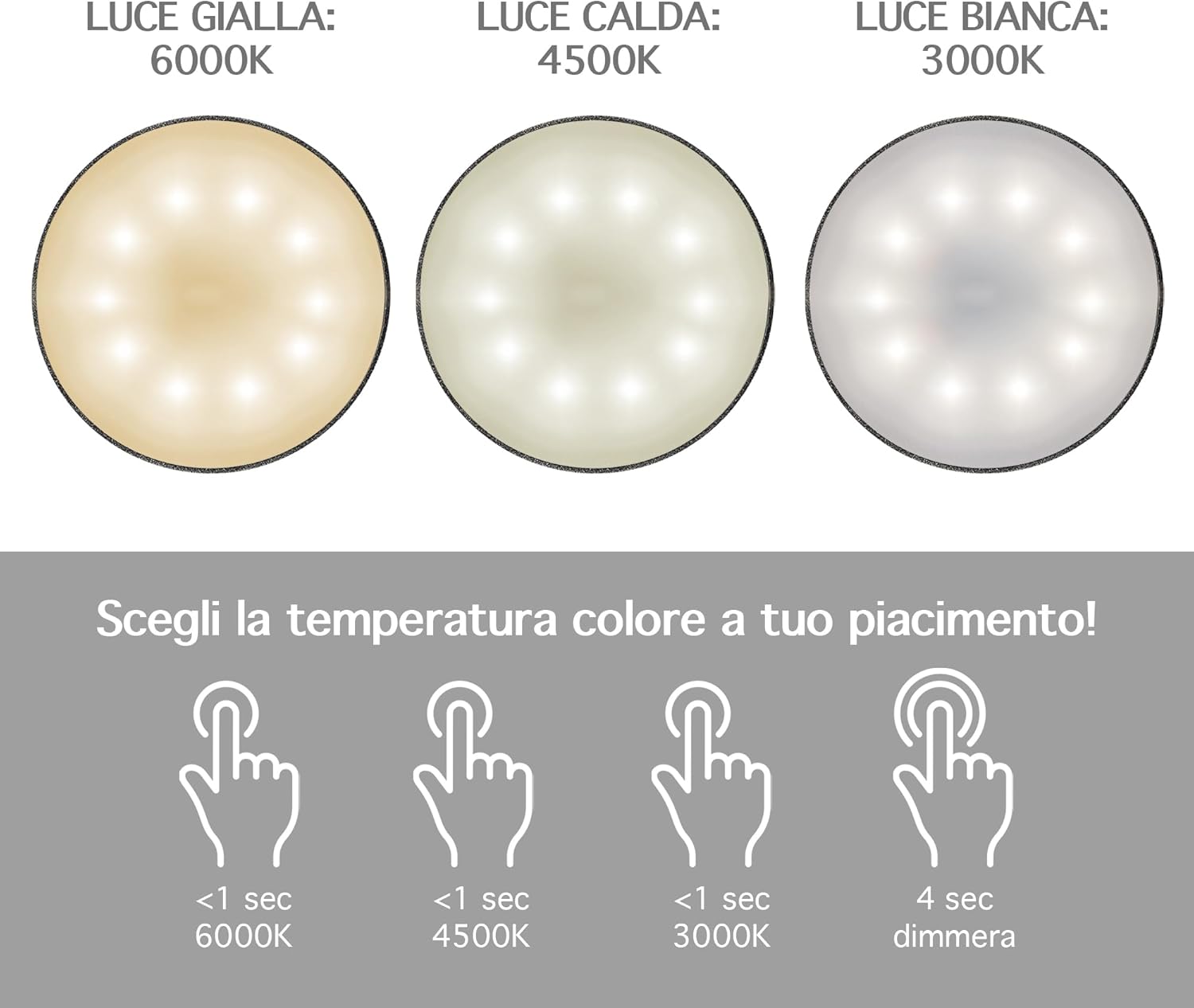 ✔️TOCCO TOUCH E DIMMERABILE: Tramite il pulsante Touch Presente sulla parte superiore della lampada con tocchi alternati è possibile cambiare il colore della luce Calda/Fredda/Naturale mentre con un tocco prolungato è possibile regolarne l'intensità ( Funzione Dimmerabile ) Con 3 Diverse temperatura di calore 3000/4500/6000 k
