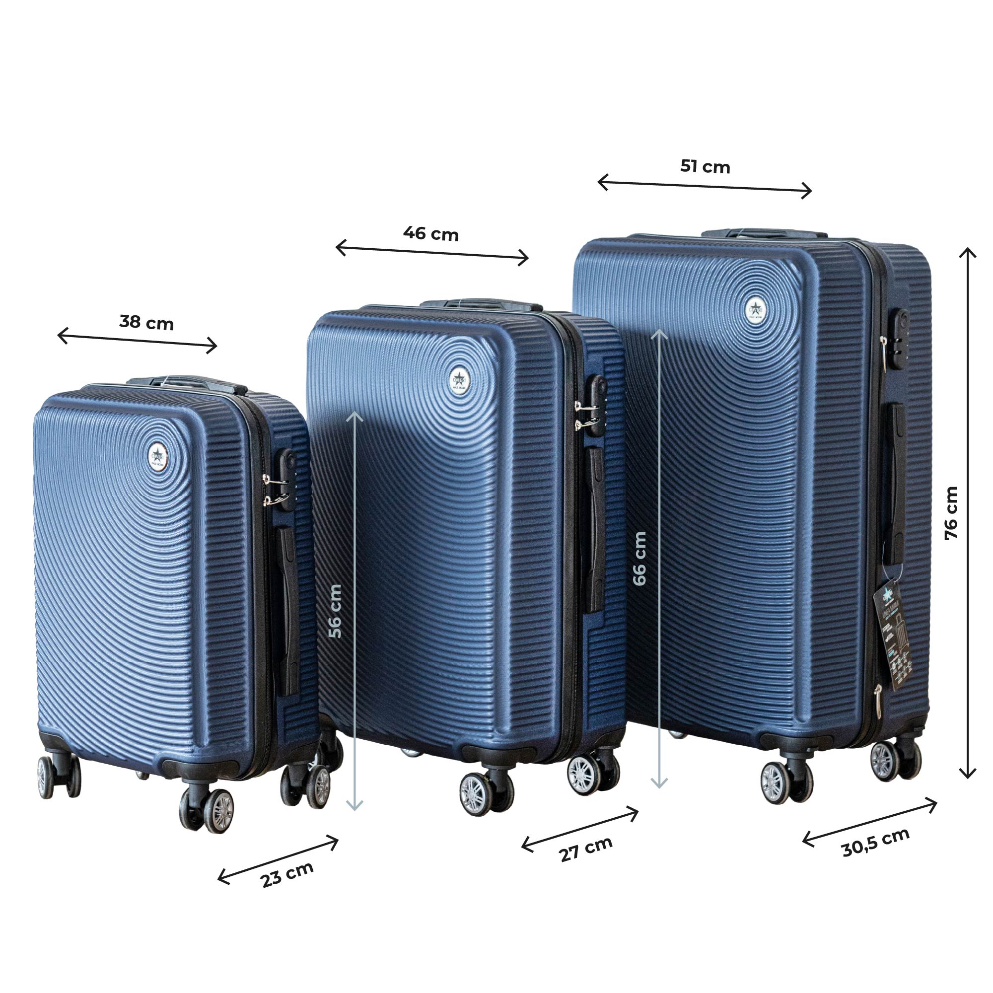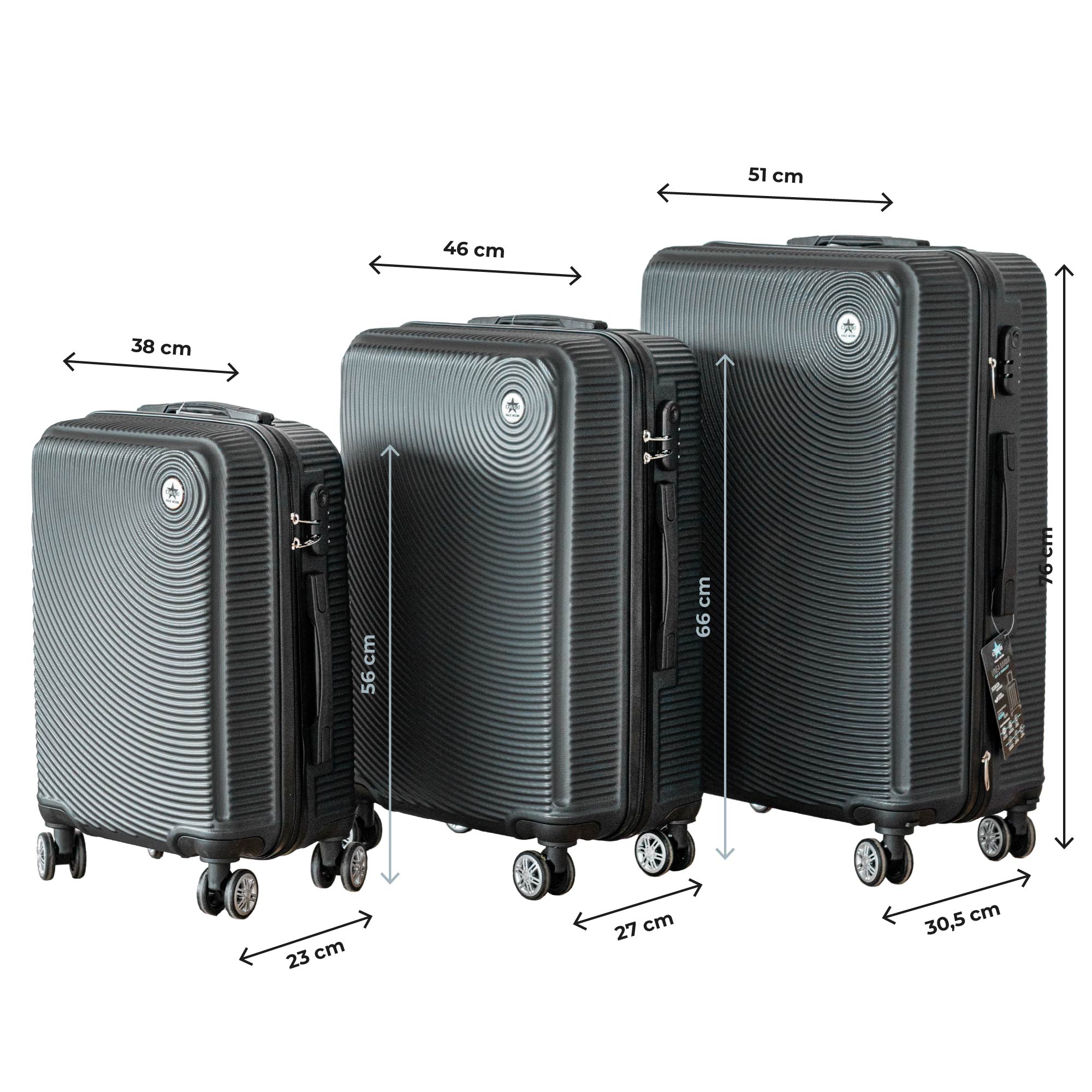 ✔️DIMENSIONI :Il set comprende tre valigie di diverse dimensioni: la grande misura 51x30,5x76 cm con una capienza di 99 litri e peso a vuoto di 4 kg, ideale per lunghi viaggi o vacanze estive; la media misura 46x27x66 cm, con una capienza di 65 litri e peso di 3,3 kg, perfetta per viaggi di media durata; infine, la piccola misura 38x23x56 cm, con una capienza di 41 litri e peso di 2,6 kg, ideale come bagaglio a mano o per brevi escursioni