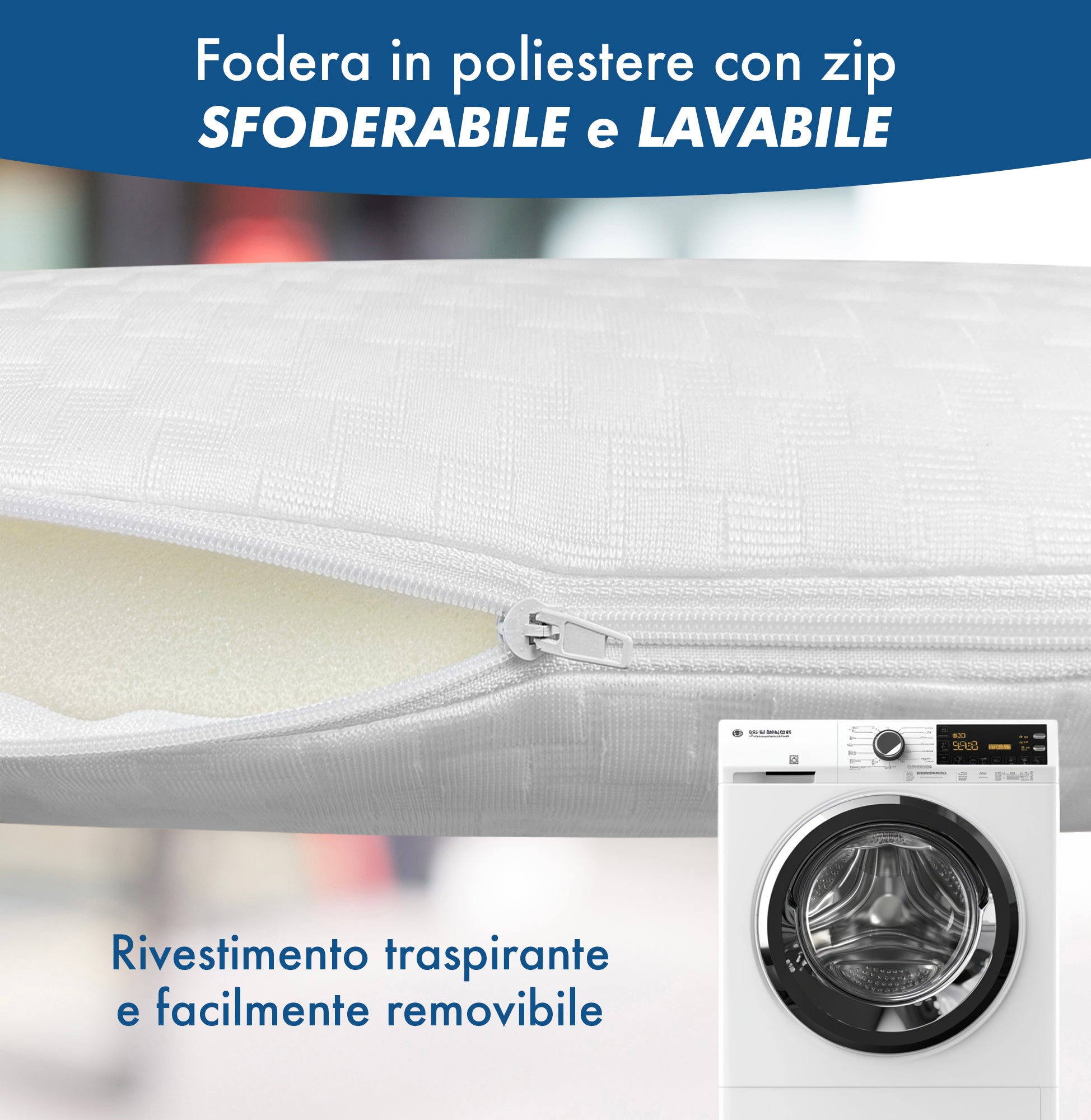 RIVESTIMENTO TESSUTO BIOELASTICO SFODERABILE:garantisce una perfetta areazione, favorendo un ambiente fresco e asciutto anche durante le lunghe ore di utilizzo. La federa può essere facilmente rimossa e lavata, assicurando igiene e praticità nel mantenimento del prodotto. In sintesi, questo cuscino rappresenta una soluzione innovativa, confortevole e di alta qualità, tutta italiana, per migliorare il benessere quotidiano.