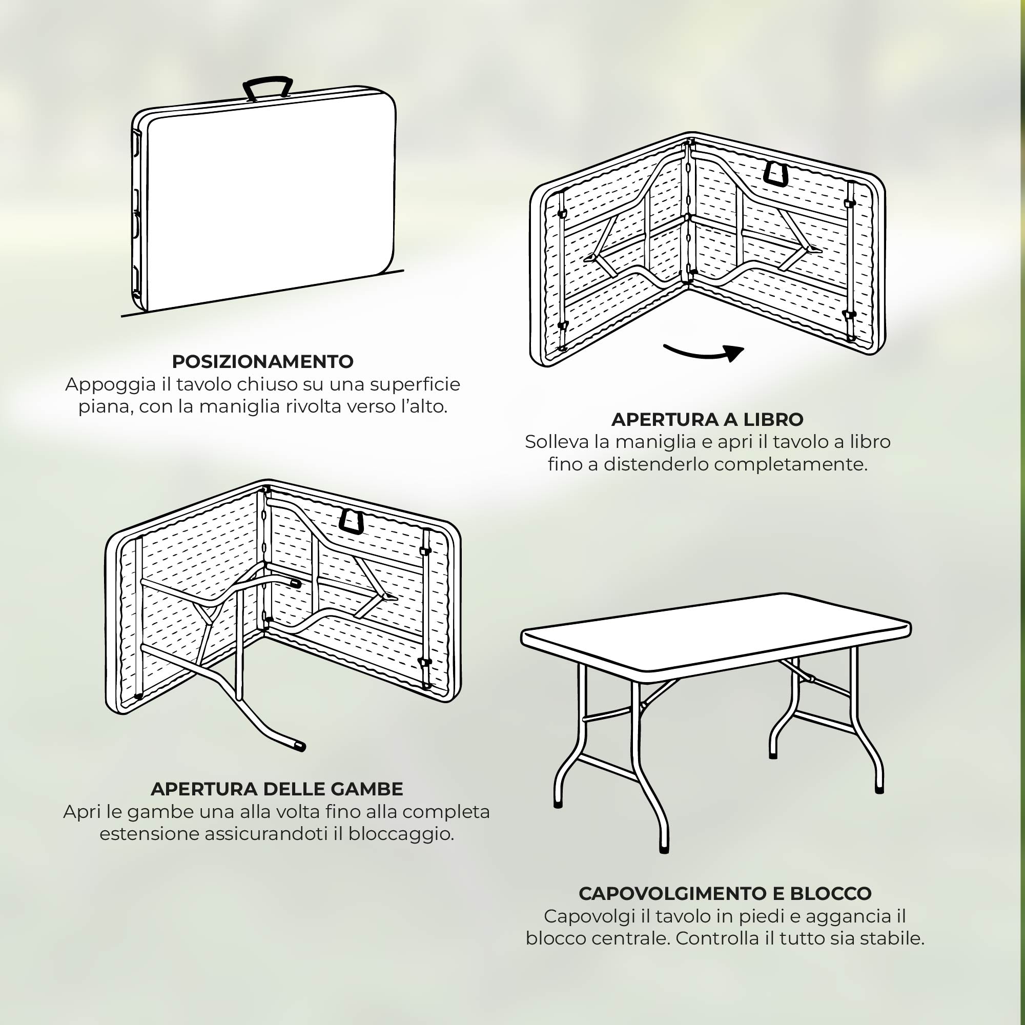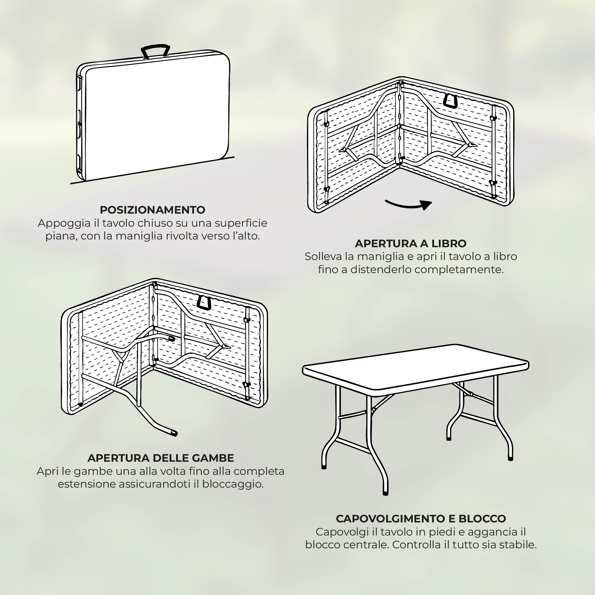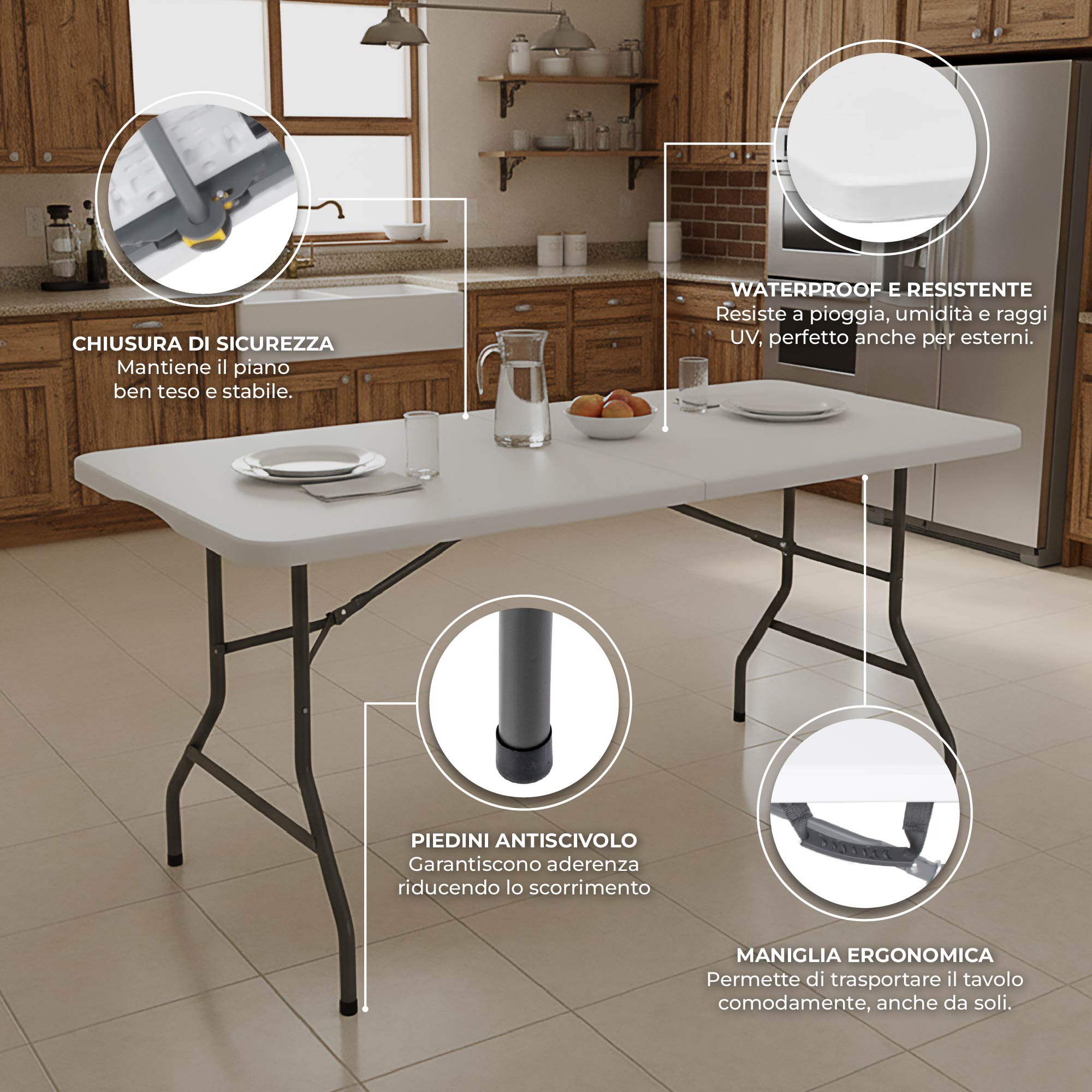 Solido e Robusto - La struttura è interamente realizzata in acciaio verniciato a polvere solido e robusto e totalmente antiruggine quindi può essere sempre lasciato montato all'aperto ma in caso di spostamenti una volta richiuso diventa facilmente trasportabile grazie anche alla pratica e comoda maniglia, inoltre è dotato di un sistema di chiusura di sicurezza a scatto che impedisce al tavolo di aprirsi durante il trasporto