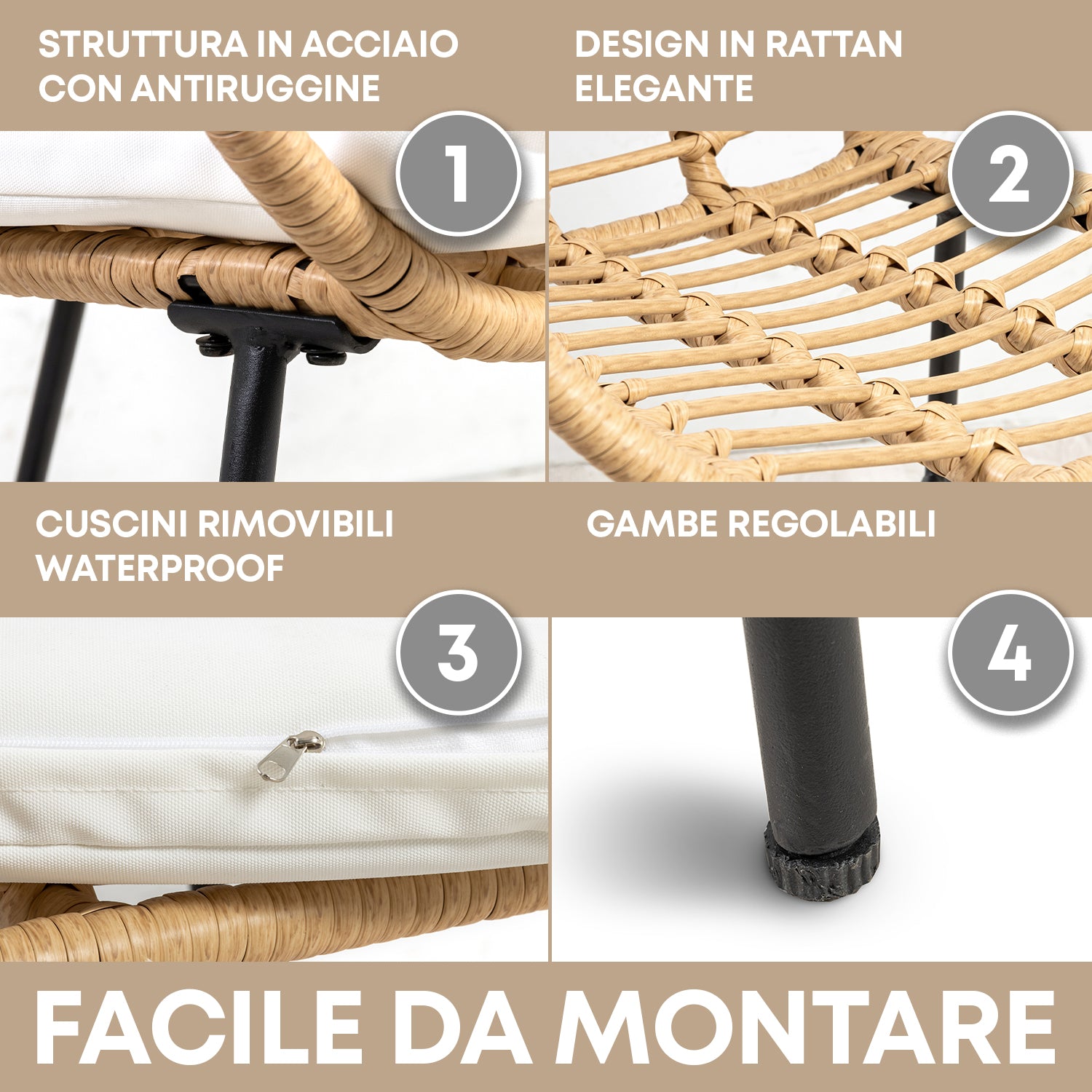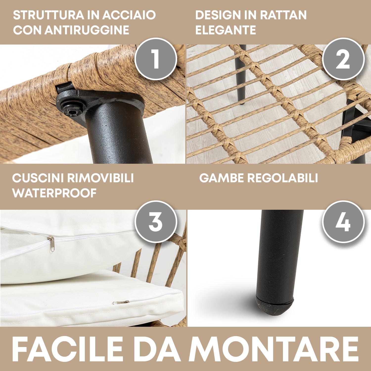 Comodità: Le sedie ergonomiche in vimini e i cuscini di seduta impermeabili morbidi sfoderabili e lavabili sono di facile manutenzione e offrono il massimo comfort di seduta.