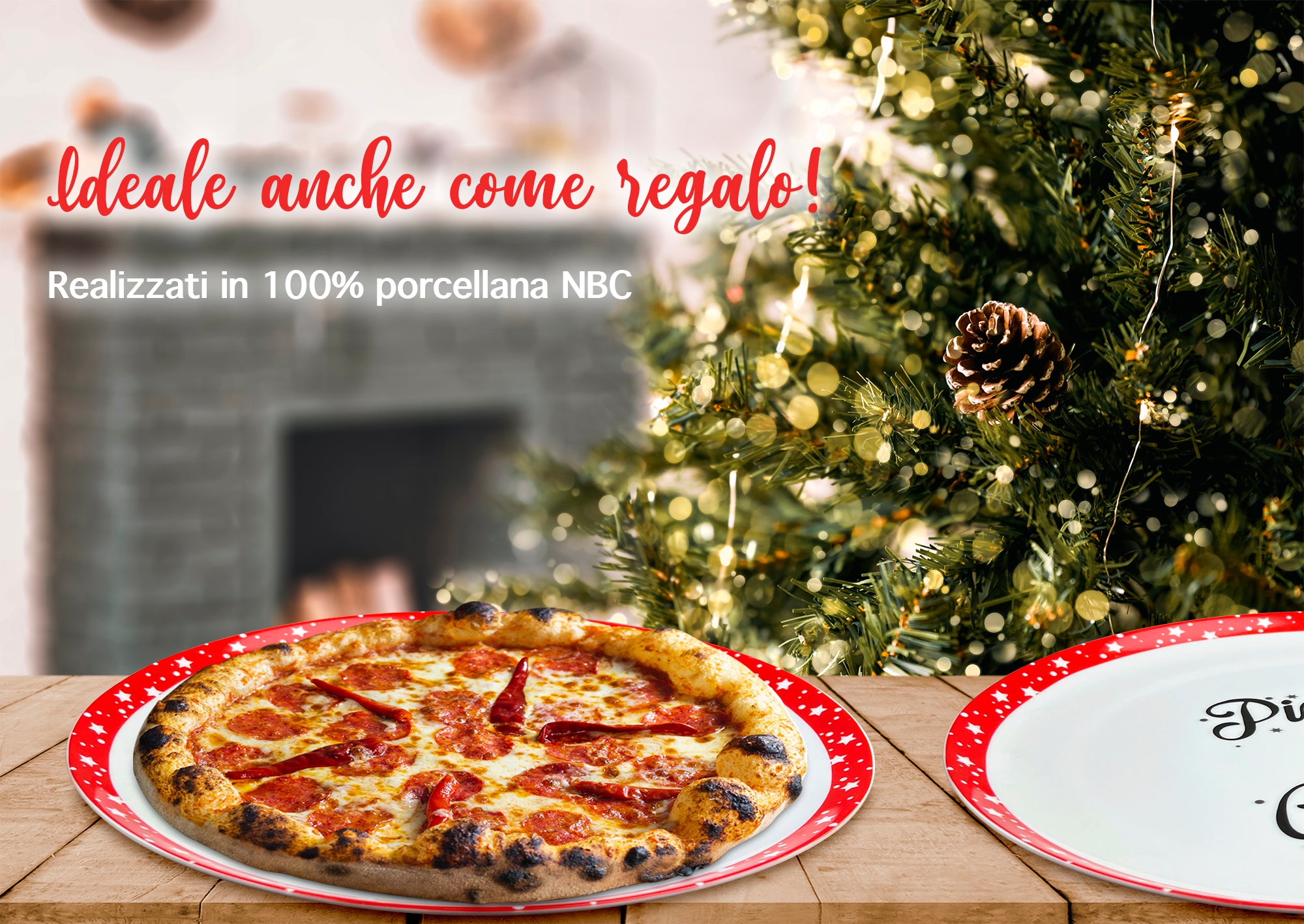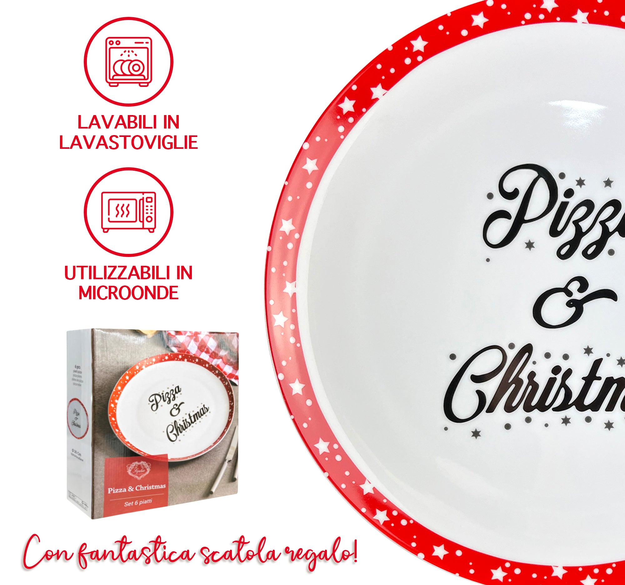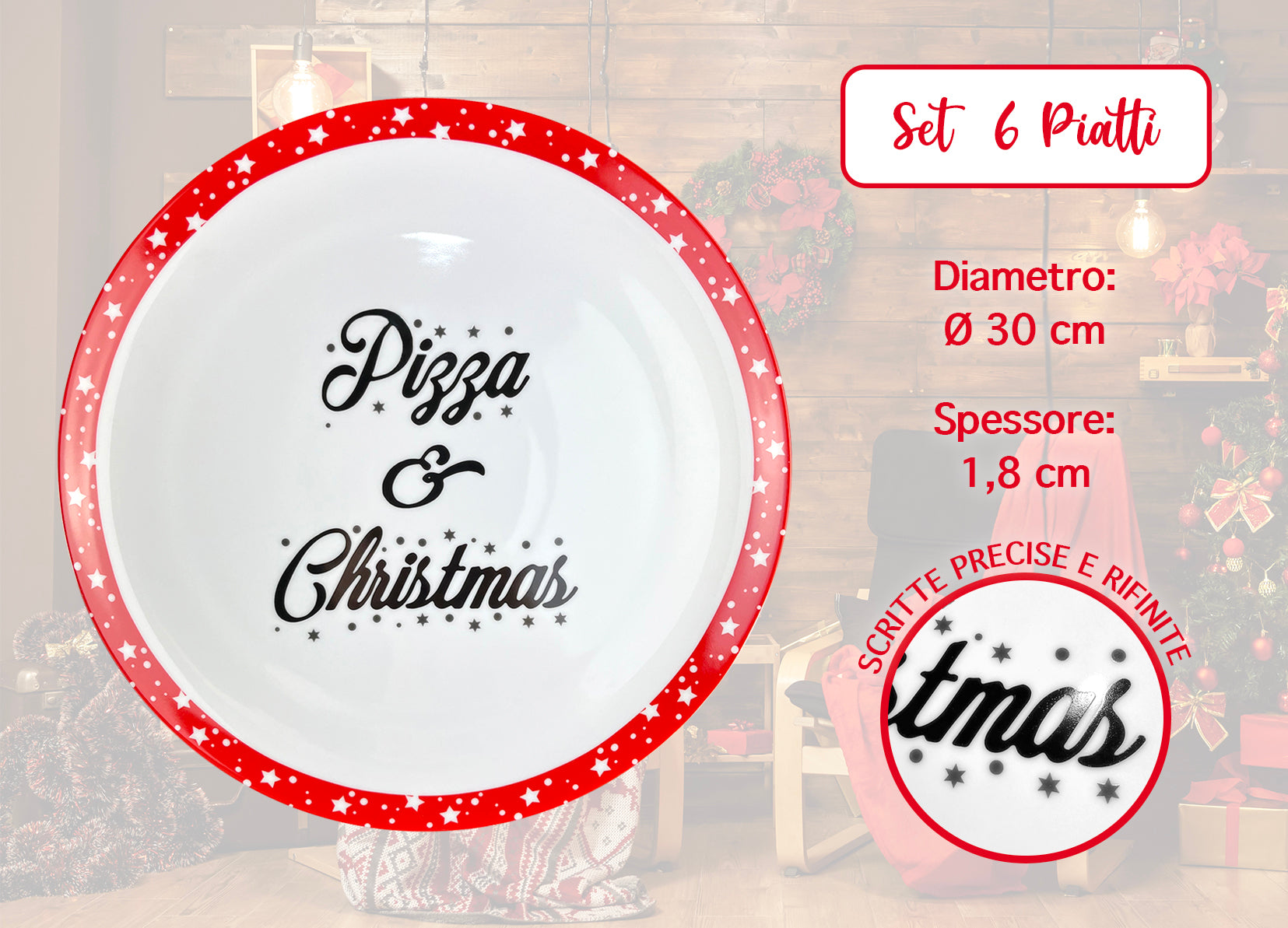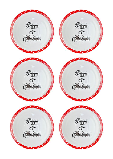 Set 6 Pezzi: Bellissimo Set composto da 6 piatti per pizza Ø 30 Cm con scritta " Pizza & Christmas" versatili utilizzabili anche come piatti per qualsiasi portata vista la grande dimensione del piatto.